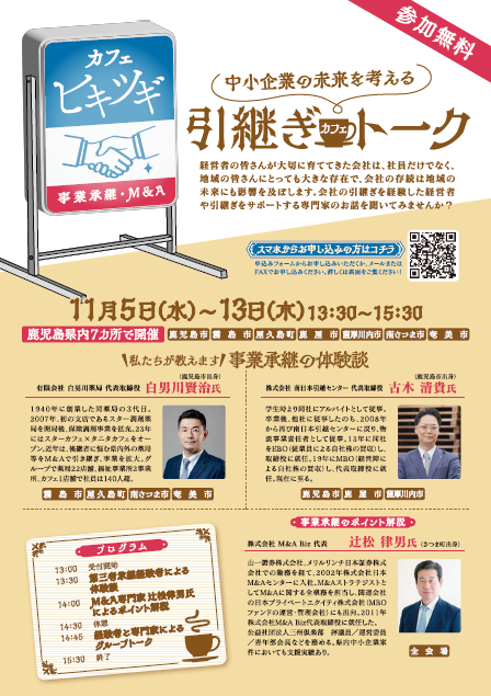 2025年11月12日(水)に、きやったもんせ南さつま(南さつま市)にて、鹿児島県主催『引継ぎカフェトーク』セミナーが開催されます!