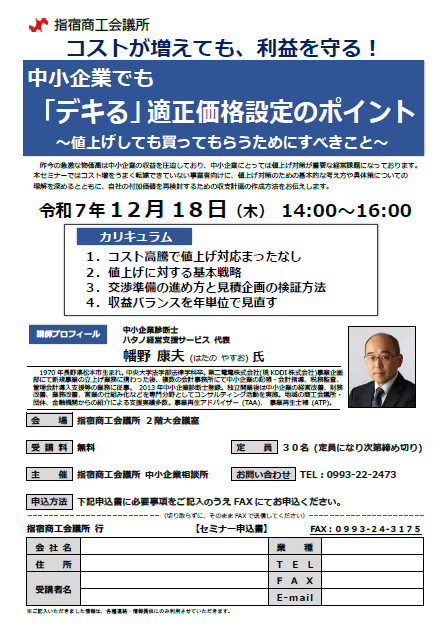 2025年12月18日(木)、指宿商工会議所にて『中小企業でも「デキる」適正価格設定のポイント~値上げしても買ってもらうためにすべきこと~』セミナーを開催します!